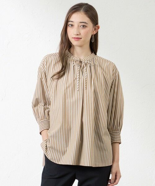 繊細なストライプ柄が目を惹くギャザーブラウス