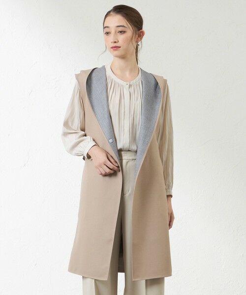 上質なダブルフェイスで一重で仕立てたフーデットジレ。打合せが深く、ゆったりとしたコンフォートな着心地が魅力です。軽さと素材の良さを活かす為に縫製技術で縫い代は極限まで無くしました。ショールカラーのようなフードデザインは、カジュアルにもきれいめスタイリングにも合わせられ、前を閉じたシックな装いから、中のコーディネートを見せてリラックスした着こなしまで、幅広いスタイリングでお楽しみいただけます。