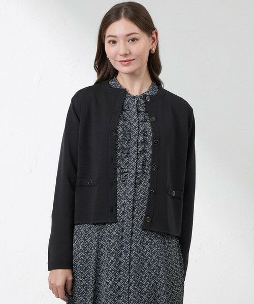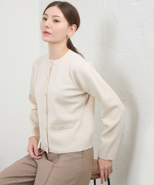 バストダーツを入れ立体感なパターンで編み立てた、光電子を交編したミラノリブのニットジャケットです。