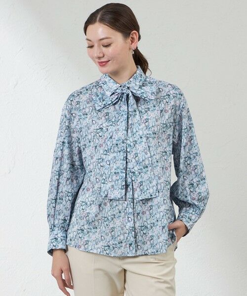 ボリューム感のあるボウタイが華やかな印象のブラウス。襟ぐりと袖口にはギャザーを入れ、ふんわりとエレガントなシルエットに。