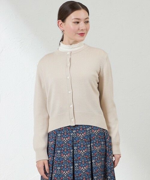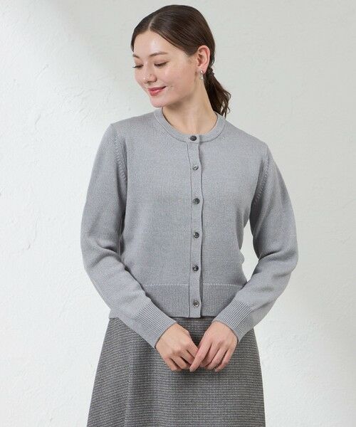 シルクの光沢が美しいニットカーディガン【デザイン】シンプルで着回しのきく丸首カーディガンです。ボトムを選ばず着回しやすい着丈になっています。前身裾は引返し編みによるきれいなカーブラインで少し短くなったデザインでスタイルアップも叶います。カラー展開はグレー・ブルー・ベージュの3色展開です。ダブルサテンスカート(V5S22-657)とあわせて上品なコーディネートもおすすめです。【素材】ソフトな肌触りが特徴で、高品質のシルクを交編し上品な光沢感をプラスしたAMACAオリジナル素材です。天然のラメともいえるシルクだからこその上品な華やかさがポイントです。手洗い可能でお手入れしていただきやすくなっております。