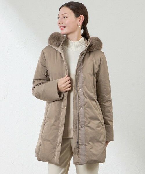 きれいめスタイルを叶える ノンキルトダウン【デザイン】ノンキルトのサテンダウン。ウエストをスッキリさせるためにプリンセスラインを入れ、ベルトなしできれいに着用可能な洗練された美シルエットに。フードにはフォックス調のエコファーが付いており、取り外しも可能になっております。【素材】サテン組織の上品な光沢が美しい素材。分量感のあるデザインながら軽やかに着用できます。適度なハリ感が構築的なフォルムを引き立てて、程よいストレッチ性も持っています。