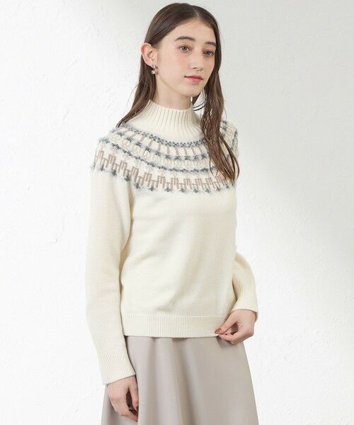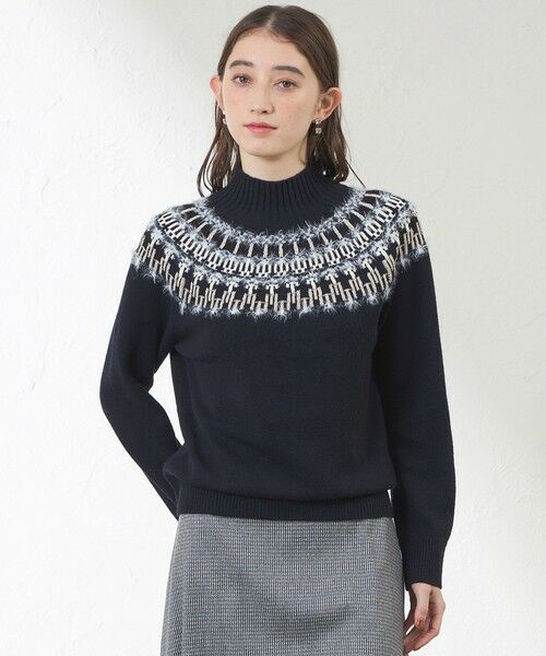 身頃はジャカード柄を2種類の表面感のある異素材で求心状に編み込み、伝統的なフェアアイルニットをモダンな印象に仕上げました。