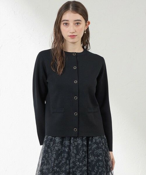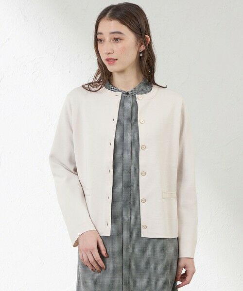 バストダーツを入れ、立体感のあるパターンで編み立てた、光電子を交編したミラノリブのニットジャケットです。