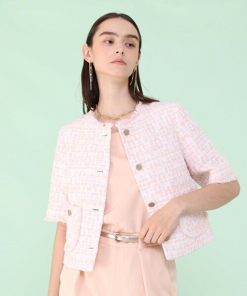 ボクシーなシルエットで、襟元からの切り替えでスッキリ見える設定の半袖ジャケット。