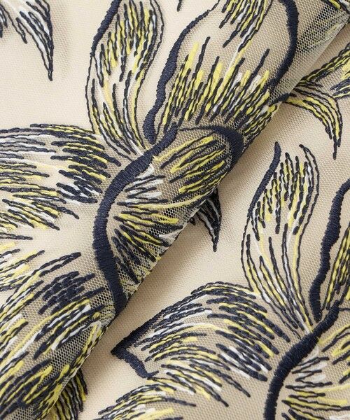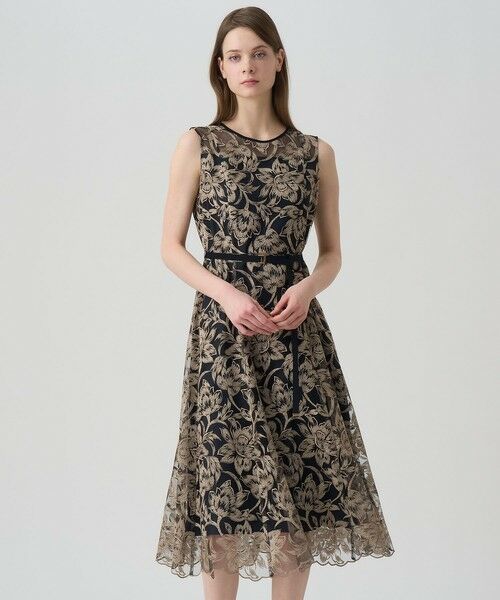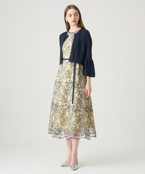 トリアセサテンペプラムジャケット 上品な光沢感のあるトリアセテートサテンでウエストにタックをいれシェイプさせたコンパクトなデザイン。 襟元はV開きで顔周りが華やかに見えます。 アートフラワーエンブロイダリーワンピース トルコのインポート素材で繊細なチュールに華やかなフローラル柄が刺繍された生地。 上身頃はすっきりと、ウエストから裾に向かって広がるフレアシルエットが上品な印象になります。 スタッフ 164cm ジャケット着用 36 ドレス着用 36