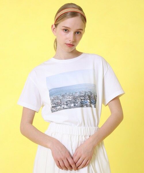 white(05)は海辺の風景のフォトプリント。ボーダーのパラソルが目を引く、程よい存在感がコーディネートのアクセントになります。