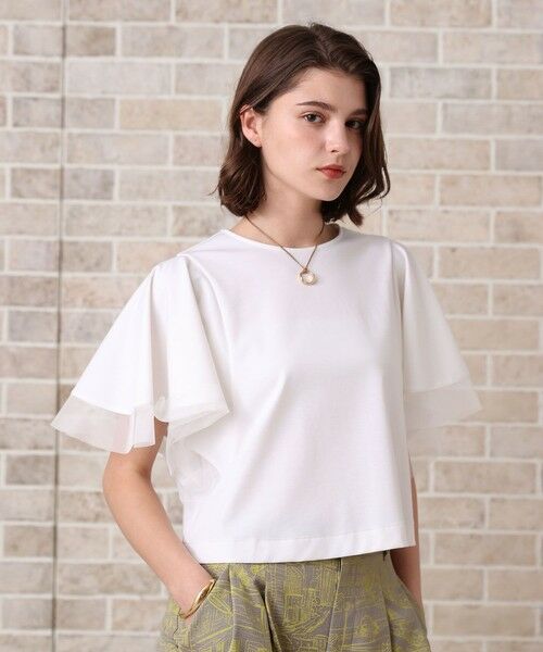 シンプルなボクシーラインに、揺れるラッフル袖がポイントのトップスです。