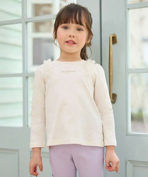 ショルダー部分のチュールフリルデザインがキュートな、長袖Tシャツ。パンツにもスカートにも、どんなボトムスにも合わせやすい万能トップスです。カラーは定番のエクリュ(#002)・ネイビー(#075)、肌なじみの良いピンク(#012)・サックスブルー(#073)・ラベンダー(#082)と豊富な5色展開!綿100%の素材で、お子様の肌に優しい設計です。