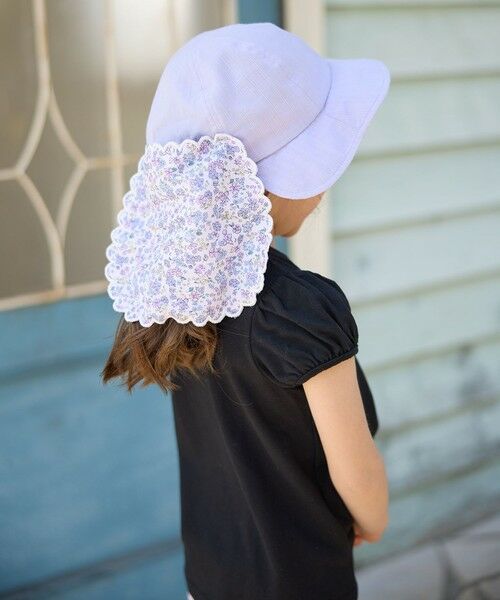 後ろの小花柄×リボンデザインがかわいい、ハット。リボンの中心のボタンを外すと首元をカバーしてくれる日よけハットに♪