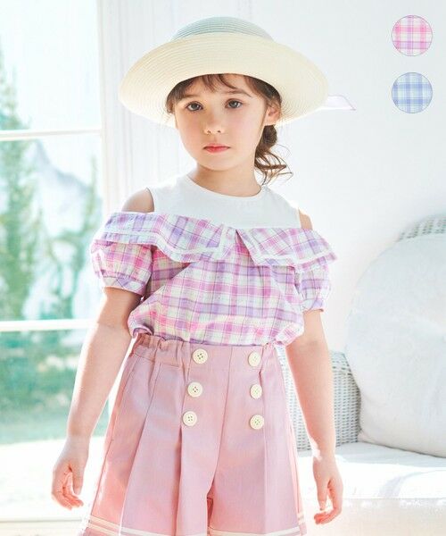 キッズ/半袖/チェック/オフショルダー/ブラウス/ドッキング/おでかけ/通園/通学/人気/デイリー/女の子/ガール/サスティナブル