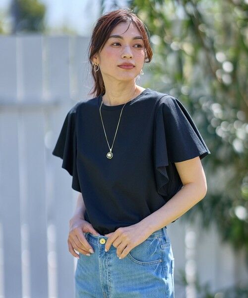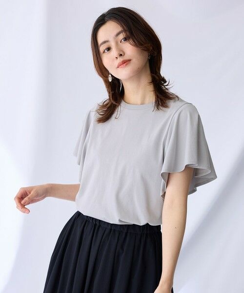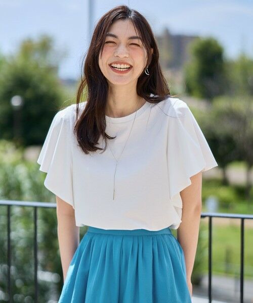 ・二の腕を程よく覆ってくれるふんわりとしたフレアースリーブ・カットソーですが滑らかな表面感も相まって、ブラウスのような見え感に・シンプルながらも袖に動きがあるだけで華やかさUPしてくれる
