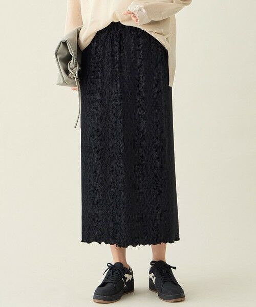・秋冬気分を盛り上げる、こなれ感とラクな着心地を両立した優秀スカート・ベロア生地にシュリンクプリーツを施し、表情豊かな素材感が魅力・ナローシルエットながら身体のラインを拾いにくく、安心感のある着用感・ウエストゴム仕様で穿き心地も抜群