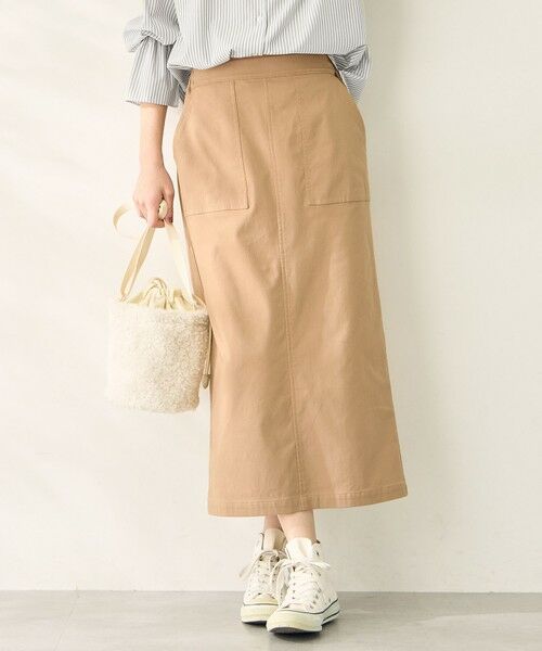 ・きれいめカジュアルなベイカーディティールのIラインスカート・後ろウエストゴム使用でストレスフリーに着用できる・ウエスト内側にドロスト入りでサイズ調節可能・シンプルなデザインで、合わせるトップスを選ばない