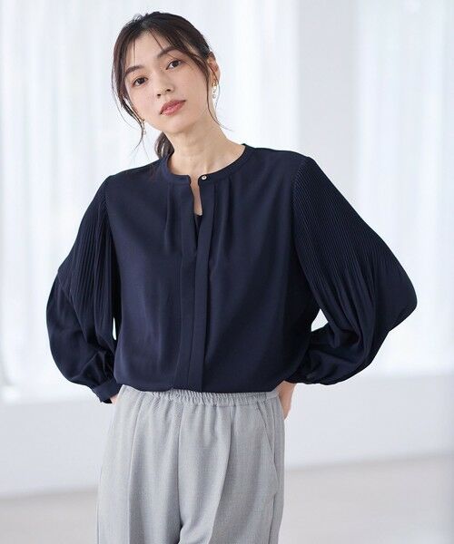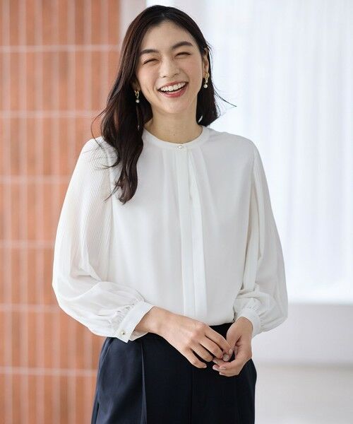 ・袖のプリーツデザインが華やかな印象のブラウス・フロントのボタンを外しても着用できる、嬉しい2WAY仕様・身頃部分は裏地付き二枚仕立てで透け感が気になりにくい