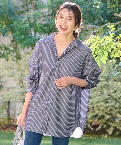 ゆったりとしたシルエットとシャツカラーが、メンズライクで大人な印象のストライプシャツです。太めのカフスは折り返してもサマになるのでコーディネートの幅が広がります。肌当たりの良い快適な着心地ながらも、パリッとしたハリ感が洗練された大人の雰囲気に。1枚での着用はもちろん、ニットやベスト等、幅広いアイテムとスタイリングできるデザインに仕上げました。羽織としても重宝する、着回しのきく活躍必至の1枚です。