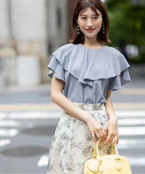 ・フレアディテールが着映えて可愛いブラウス・袖はフレンチスリーブ丈で、気になる二の腕をカバー・ややVネックでデコルテを美しく見せるデザイン・前後のフリルがウエストインでも映えるため、インでもアウトでも着こなせる