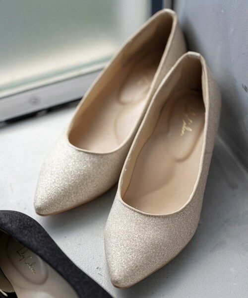 ・細かいラメ素材を使用し、ふちにグログランをまいた上品なデザイン・ヒールが低いため安定感があって歩きやすく、長時間履いても疲れにくい・セレモニーや普段のお出かけにも使える万能パンプス