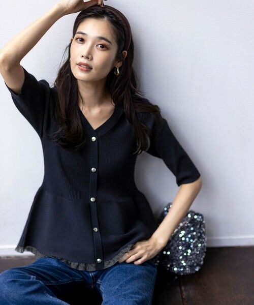 ・ペプラムシルエットがエレガントな印象を与えるニットプルオーバー・フロントのゴールドボタンと、裾からのぞくシアーなフリルが華やかなポイント・立体感のあるペプラムのフレアが腰回りをすっきりカバー・開きすぎていない上品な襟元と、リブでもぴったりしすぎない程よいフォルムで着心地も◎