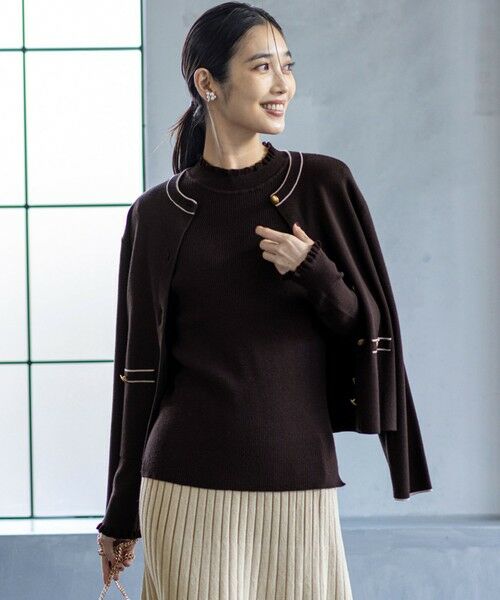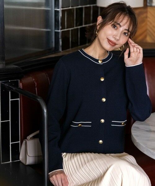 ・さりげない配色ラインが秋らしい印象のニットジャケット・スッキリとした編地で、きれいめなコーディネートにも合わせやすいデザイン・少しマットな光沢の金ボタンがアクセント