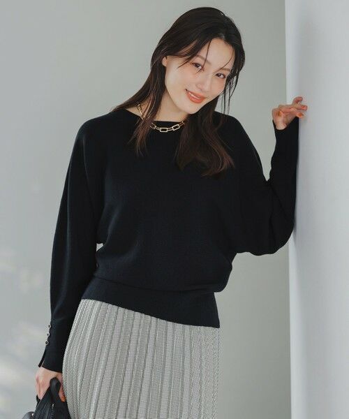 ・たっぷりとしたシルエットが魅力のドルマンニット・開きすぎないボートネックで、首周りを華奢にスッキリ見せてくれるデザイン・袖口のリブ部分にはゴールド枠の同系色ボタンがアクセント・裾にスリットが入っているので、どんなボトムスとも合わせやすく着回し力抜群