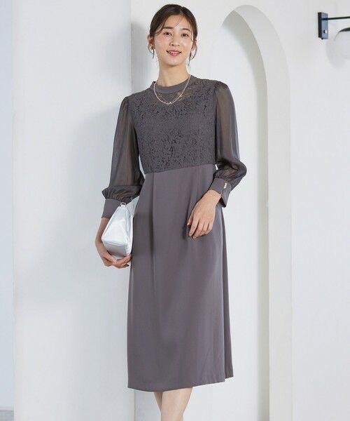 ・クラシカルな雰囲気を演出する異素材コンビドレス・レースやシャイニーシフォンを組み合わせ、上品で華やかな印象に・ゆとりのあるサイズ感ながら、上身頃のレース切替と高めのウエスト位置でバランス良く着こなせるデザイン・袖はシアー素材で抜け感をプラス、袖口のパール調装飾とスリットがさりげないポイント・後ろウエストはギャザー入りゴム仕様で、きちんと感と快適な着心地を両立・両サイドにポケット付きで、ちょっとした小物の持ち運びにも便利・結婚式や食事会など、幅広いシーンで着回しできる一着