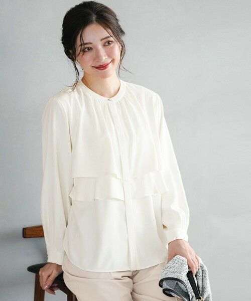 ・ティアードデザインが華やかで女性らしい・ウエストインした際にお腹周りを自然にカバー・アウトで着ても可愛いカーブデザインの裾・きちんと感のあるバンドカラーとカフスデザイン