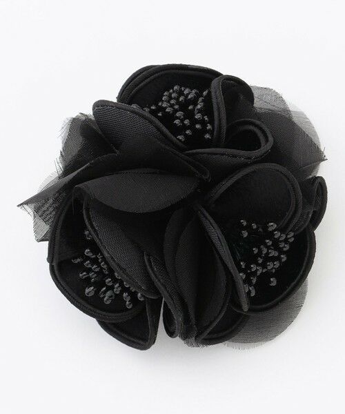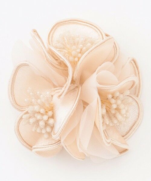 ・花びらを組み合わせた立体感のあるデザインのコサージュ・コーディネートに馴染む大人な印象の単色使い・お洋服に穴をあけずに着用できるピンクリップ付き