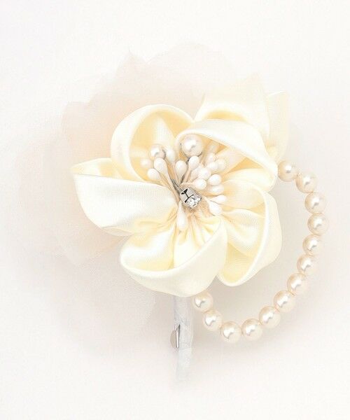 ・サテン生地のお花にエアリー感のある素材をあしらったコサージュ・上品な光沢感がセレモニースタイルに映えるアイテム・フェイクパールのラインがポイント・お洋服に穴をあけずに着用できるピンクリップ付き