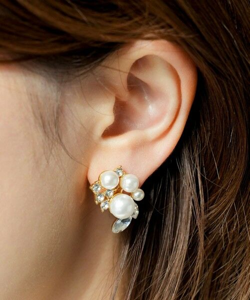 ・華奢なビジューとパール調モチーフを組み合わせた、立体感とボリュームのあるイヤリング・顔まわりを上品かつ華やかに彩るデザイン・結婚式やセレモニースタイルなど、特別なシーンにぴったりのアイテム