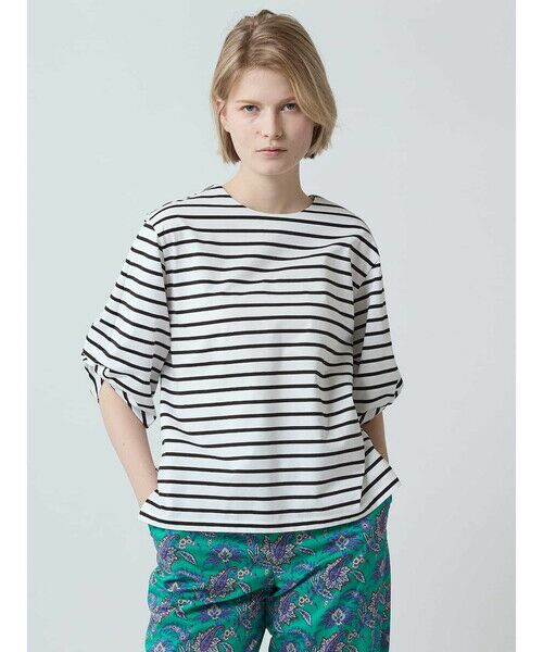 肘まで隠れる長めの5分袖はインするとバランスが良く、ワイドパンツやフレアスカートと合わせたスタイリングがおすすめです。