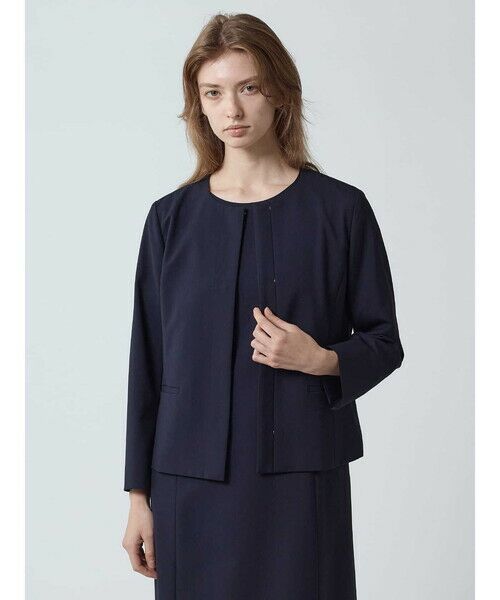 前端へ施したAMFステッチがアクセントの、女性らしいラウンドネックのノーカラージャケットです。