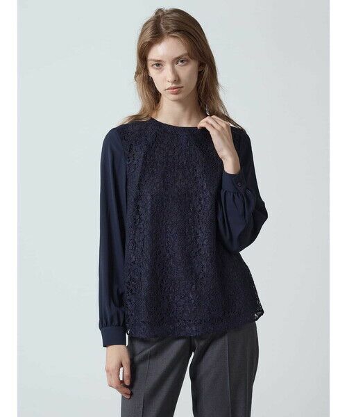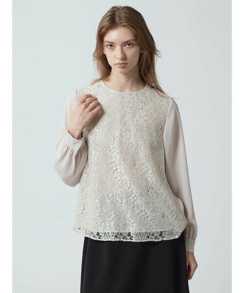 前身頃へ施したコードレースがフェミニンな雰囲気のラウンドネックブラウス。