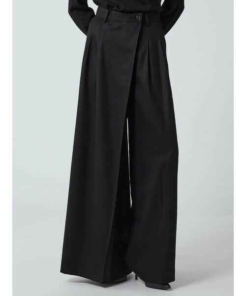 フロントは折り重なるようにタックを取ったアシンメトリーなデザインで、まるでロングスカートのようなモードな印象に仕上げています。