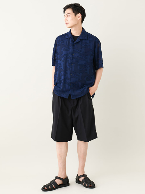 トレンドの透け感のあるシアー素材にジャカード織で植物柄を表現したオープンカラ—シャツ。