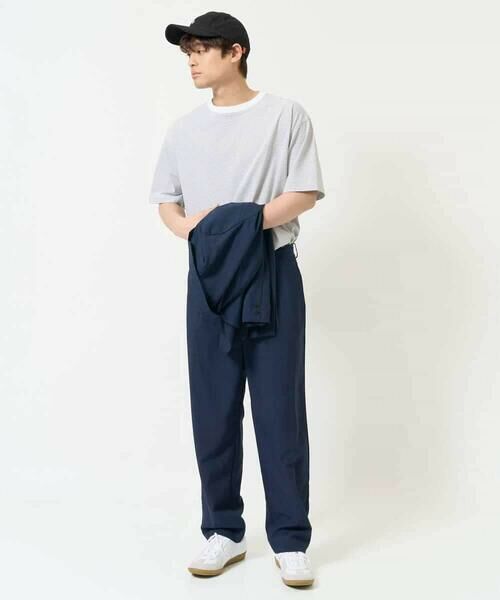 スラックス合わせできれい目スタイルに。ゆとりのあるパンツとあわせるとカジュアルな印象に。 タックインしてもバランスが良いコーディネートが完成します。
