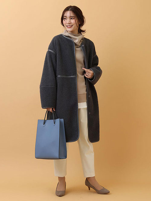 ◆大人かわいいボアコート◆トレンドライクなムートン風ボアコート。暖かみのあるボアに合皮パイピングラインがメリハリを持たせ、羽織ればスタイリングの主役になってくれる優秀アウター。すっきりとしたノーカラーは綺麗目スタイルにも相性がよく、また首元はストールを巻いてももたつかない!大人の女性にぴったりのボアアウターです。