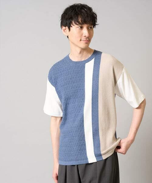 身頃をニット編みで縦に切り替えて柄を表現、異なる編地を使用したテクニックがこだわりポイント。