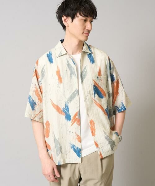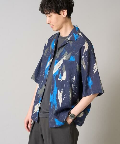 ◆透け感・凹凸感のあるドビー素材にアーティスティックなペイント柄のプリントを施したオープンカラ—シャツ◆