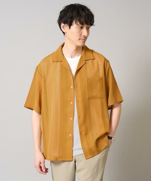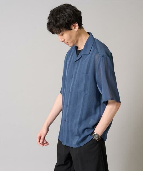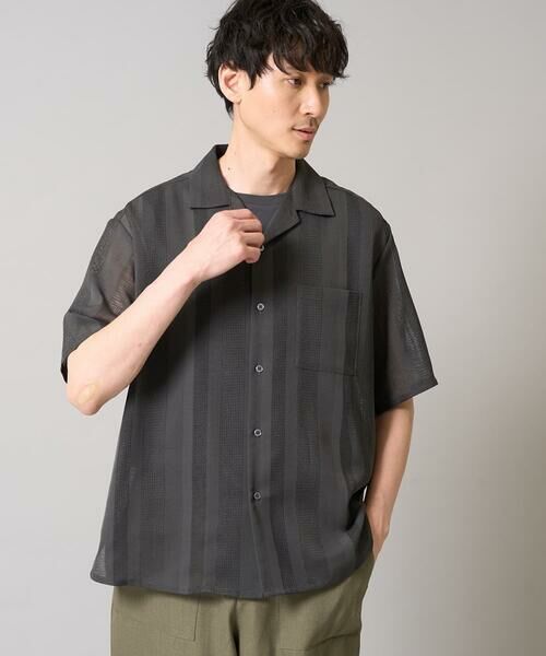 カラミ織り素材にランダムストライプを表現したオープンカラーシャツ◆