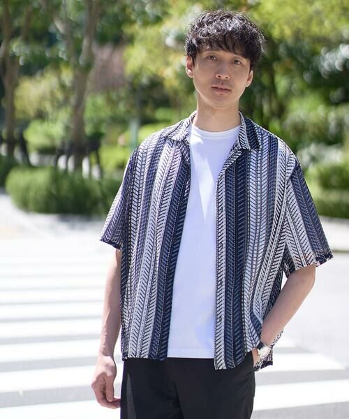 今季トレンドのニットストライプ素材を使用したオープンカラ—シャツ。