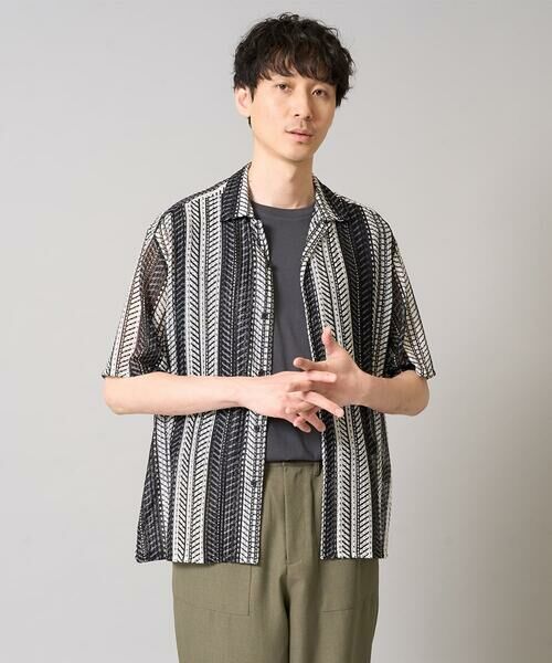 透け感のあるニットストライプ素材を使用した五分袖オープンカラ—シャツ◆