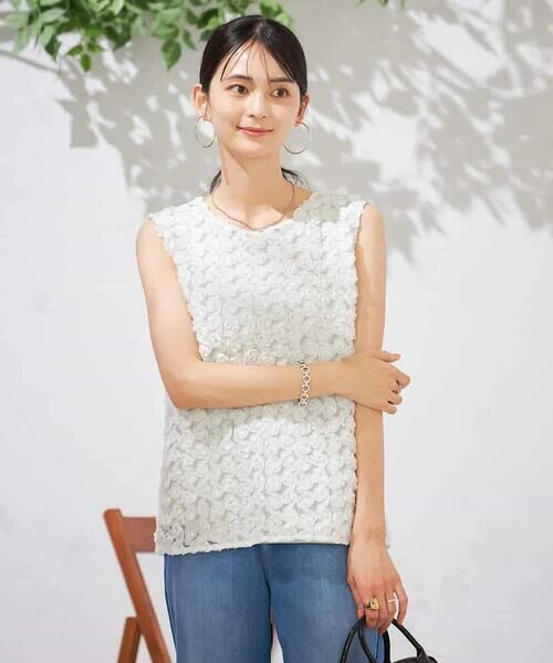 ・フェミニンなバラモチーフですが、ノースリーブでラフ見えし大人な着こなしが叶います