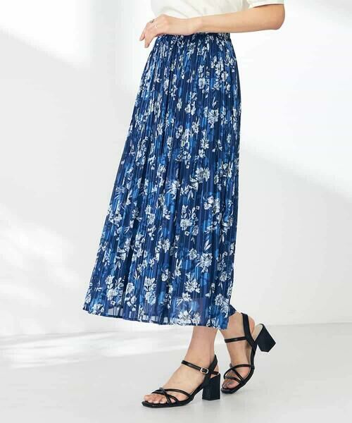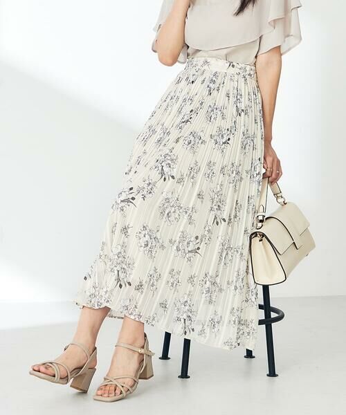 ・ランダムなサテンストライプ地に細プリーツ加工と花柄を施した贅沢なスカート