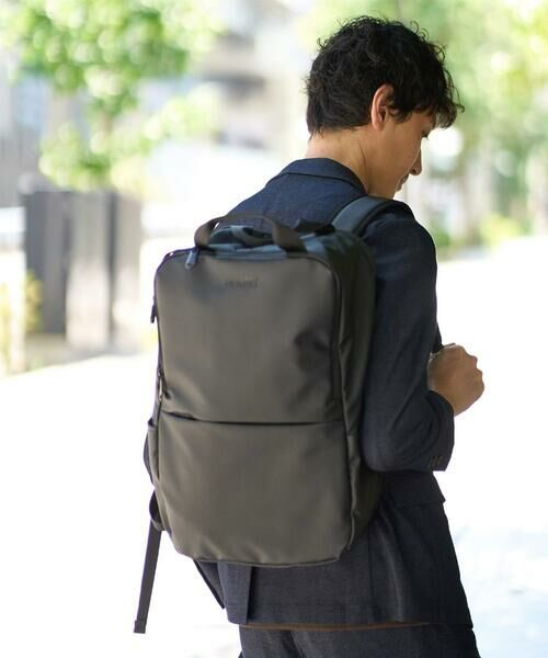 マットコーティングされた素材を使用し、ビジネスユースにも使用できる十分な容量があるスクエアデザインリュックです。
