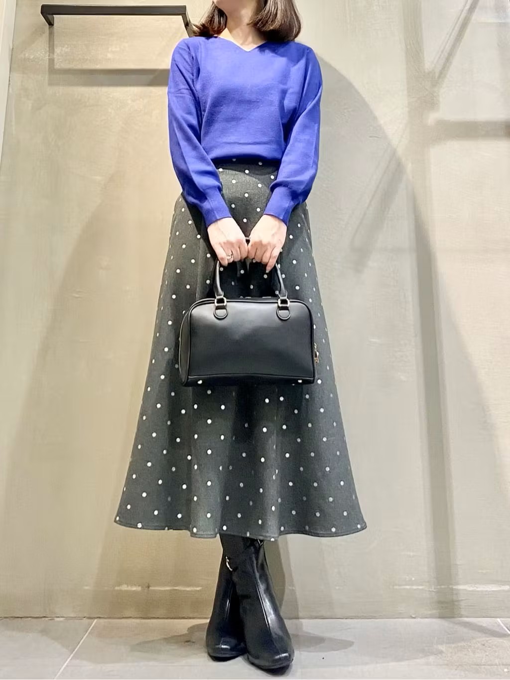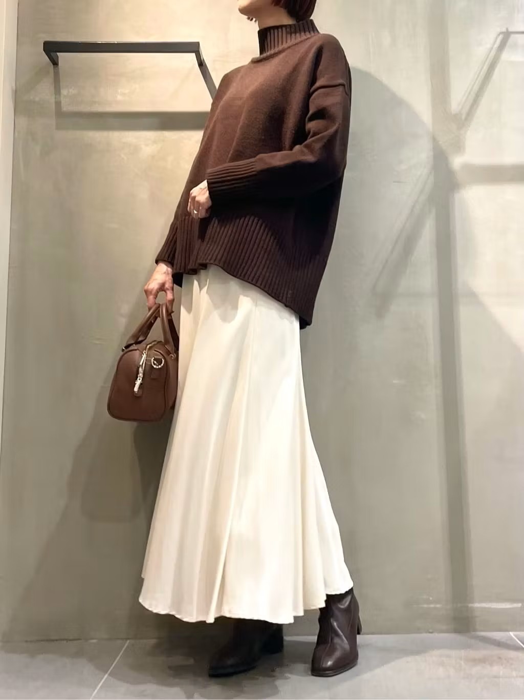 デイリーに使えるきれいめカジュアルニットなので、ワイドパンツやデニム合わせも決まります。