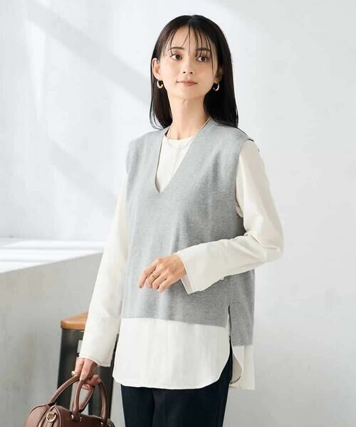 ・深めのVネックでレイヤードスタイルもすっきり見え