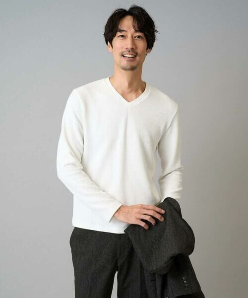 一枚で着てもサマになり、特にテーラードジャケットとのきれいめスタイルがオススメです。