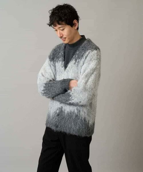 インパクトのあるぼかし柄を大胆にニットで表現した起毛シャギーカーディガン。