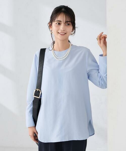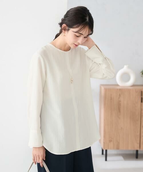 シンプルなノーカラーブラウスは一枚着でさらっと、